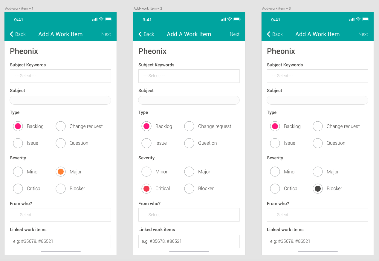 Adding a work item with the option to add keywords, subject and option to select its type and severity.